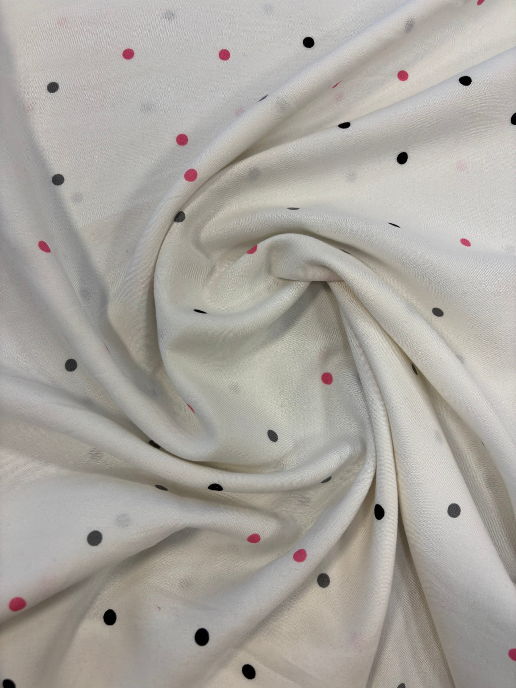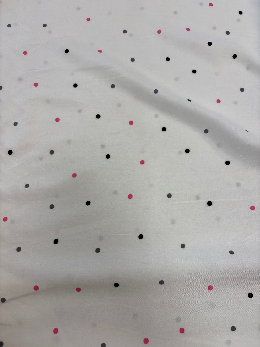 Viscose estampada com padrão poá de bolinhas pretas, cinzas e rosa no fundo branco.