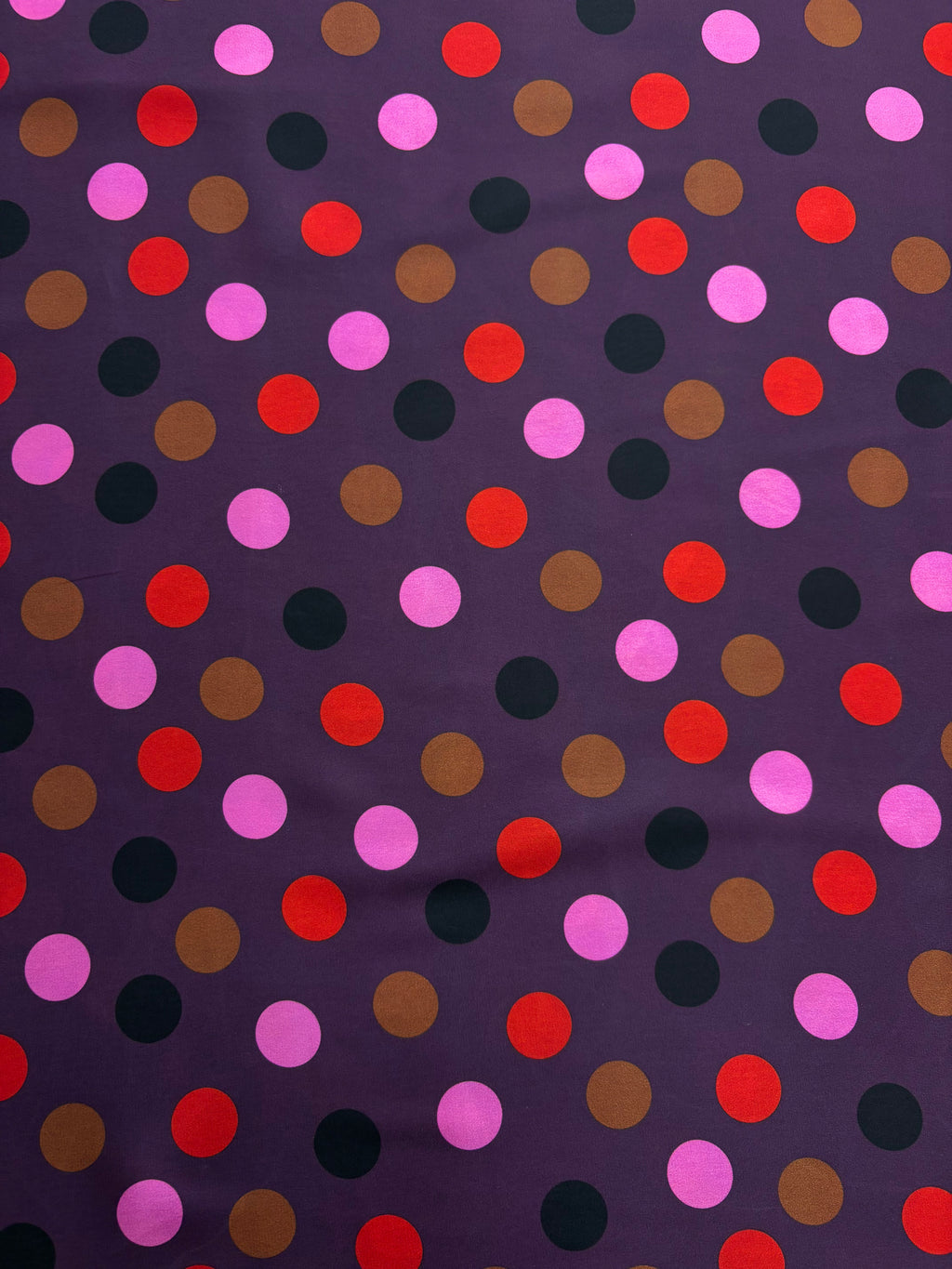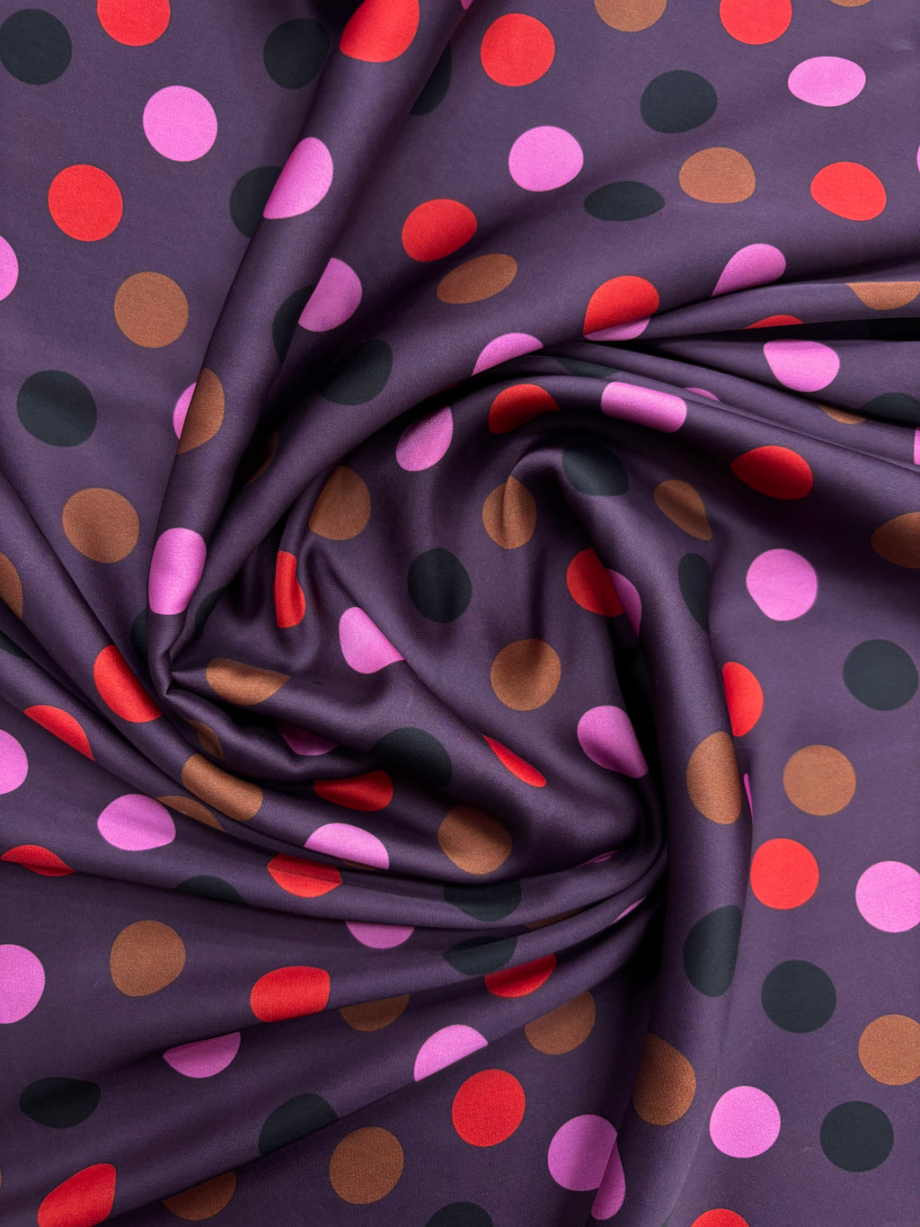 Cetim bianchini estampado poá. Fundo roxo e bolinhas coloridas.