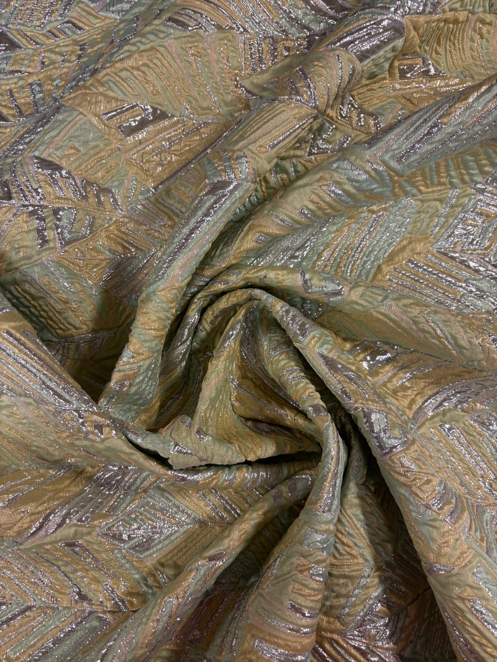 Brocado, desenho metalizado em verde com amarelo e prata. Vem entretelado.