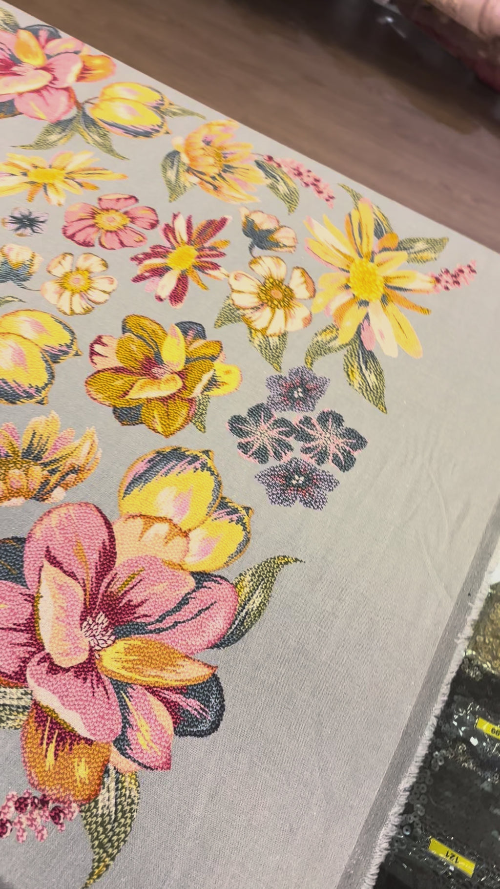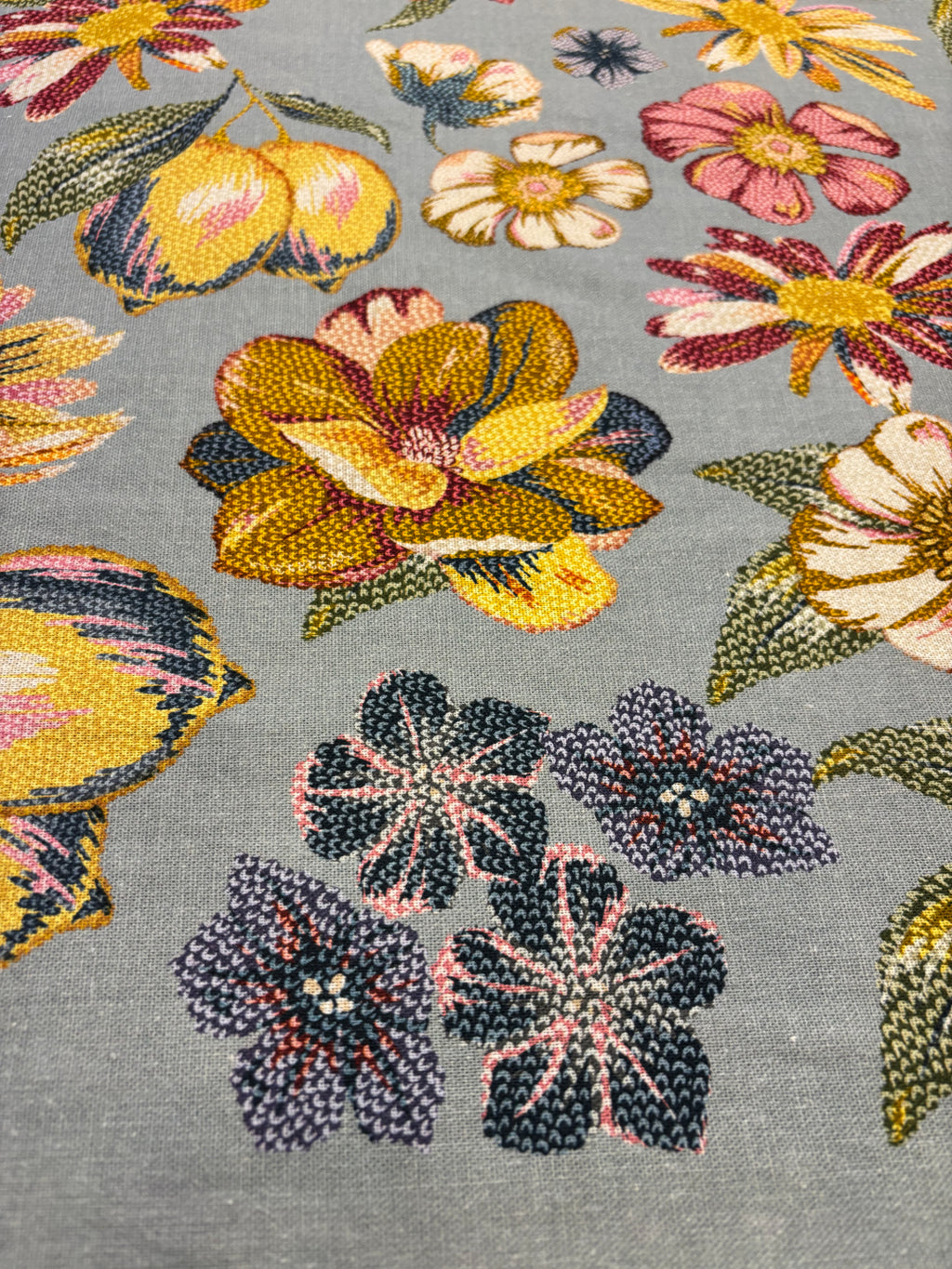 Linho misto estampado.LENÇO. Fundo verde acinzentado, com estampa floral colorida.