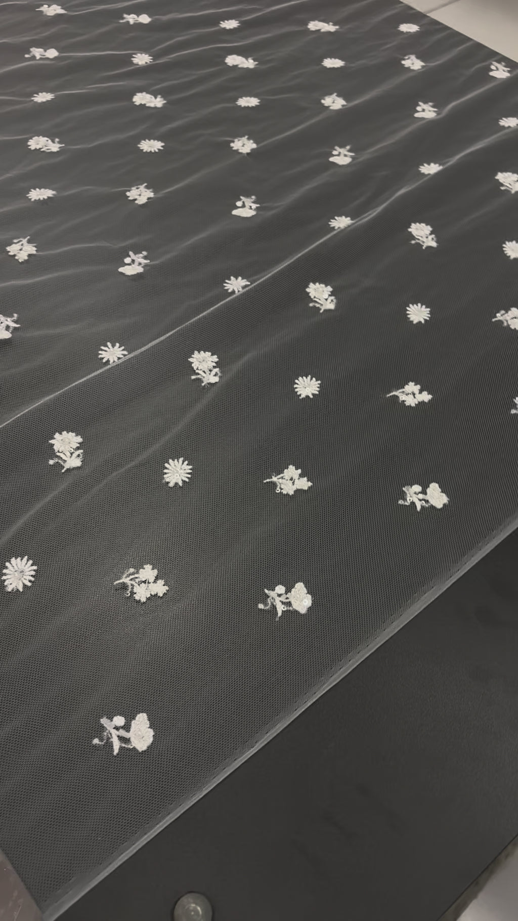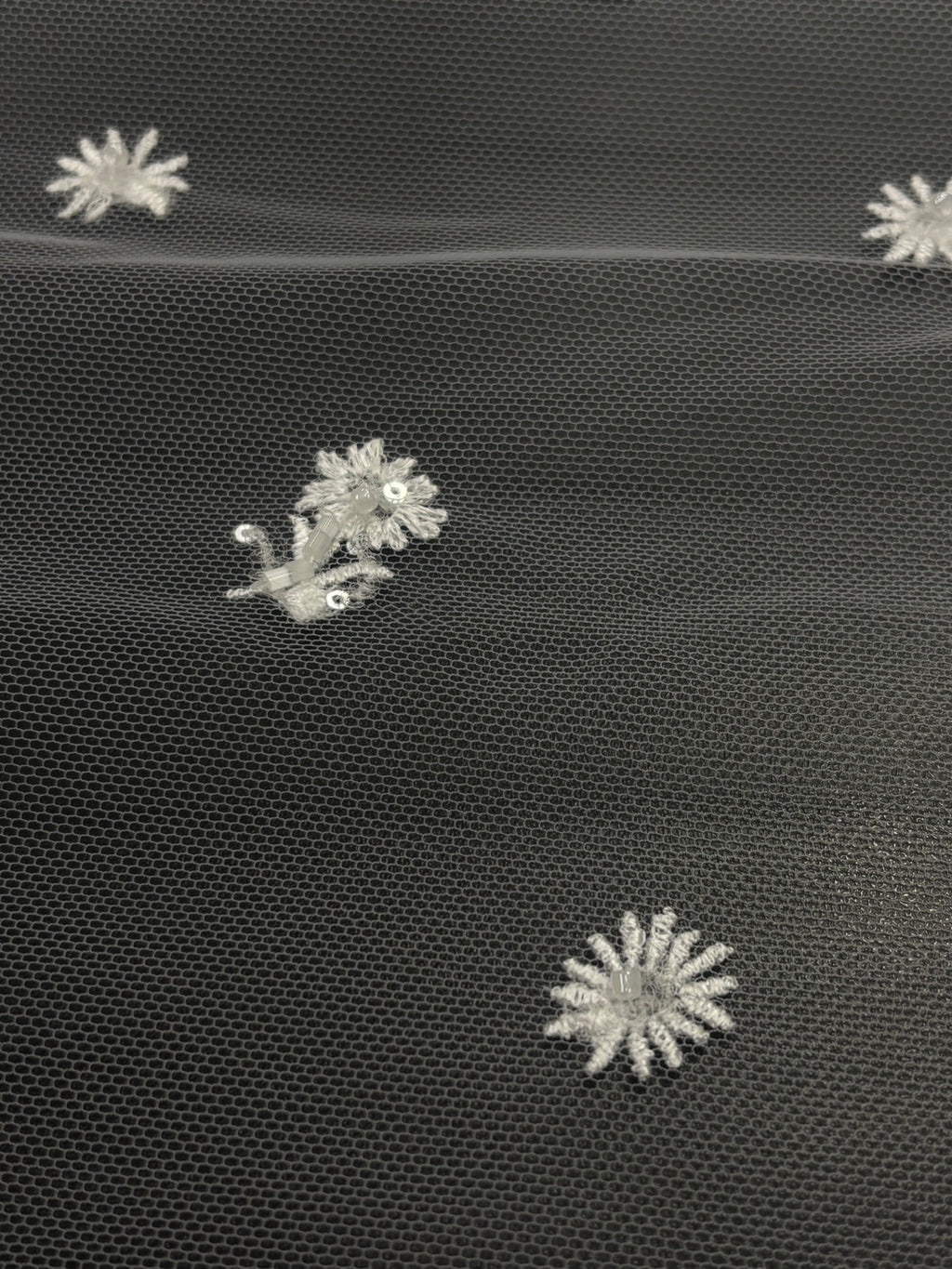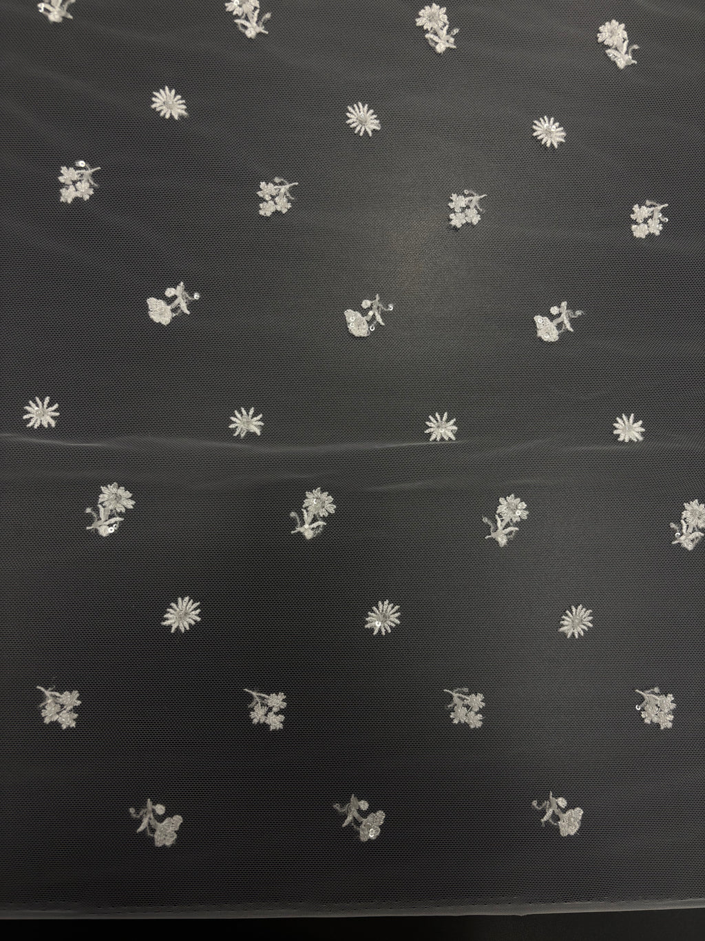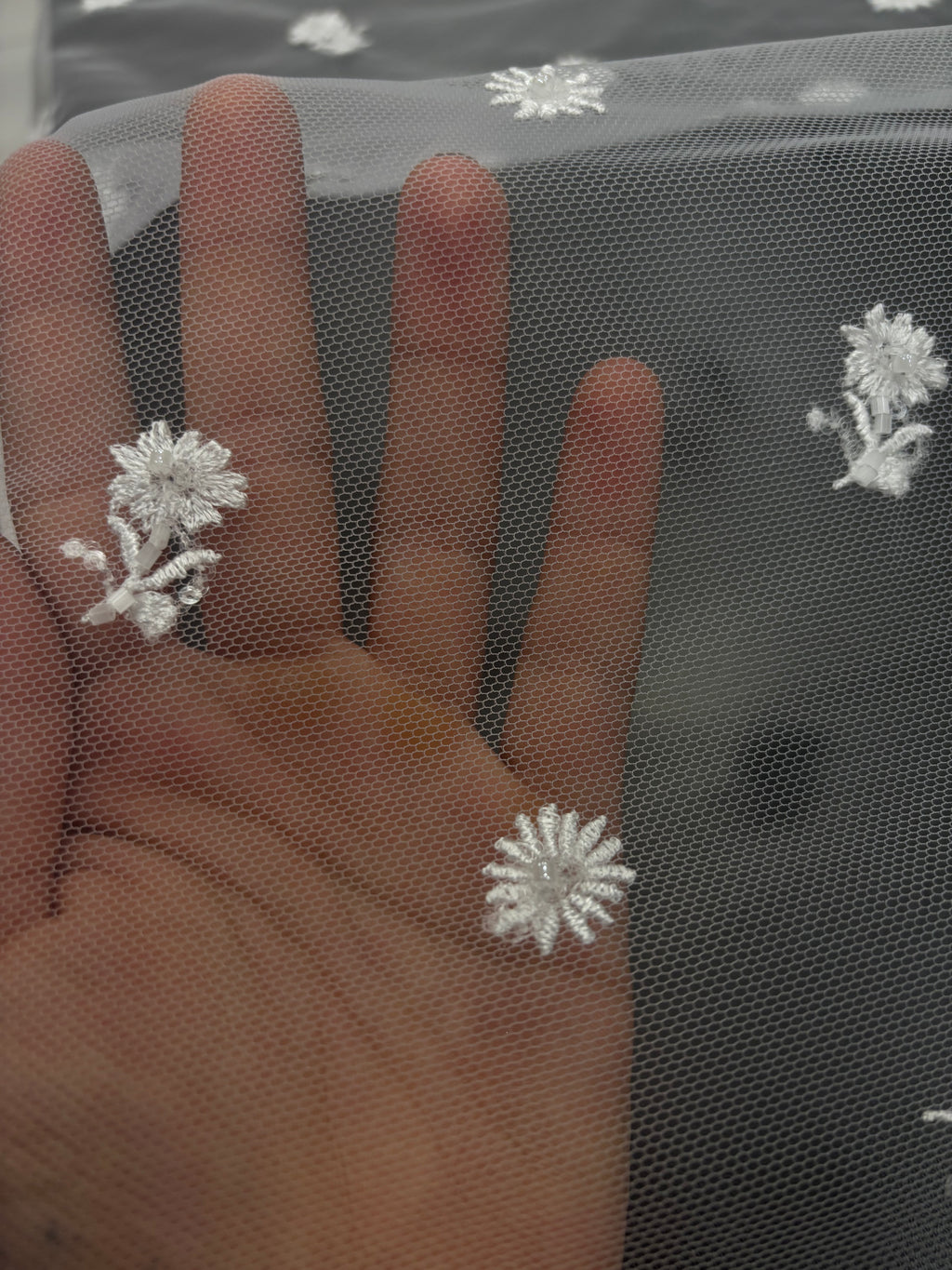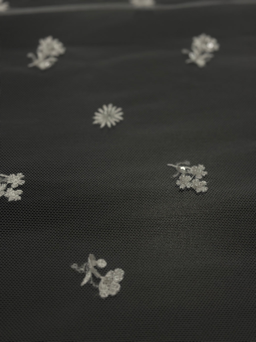 Renda bordada tule off white. Bordado delicado de mini florzinhas com pequenas pedrarias e micropaetês. Sem bico.