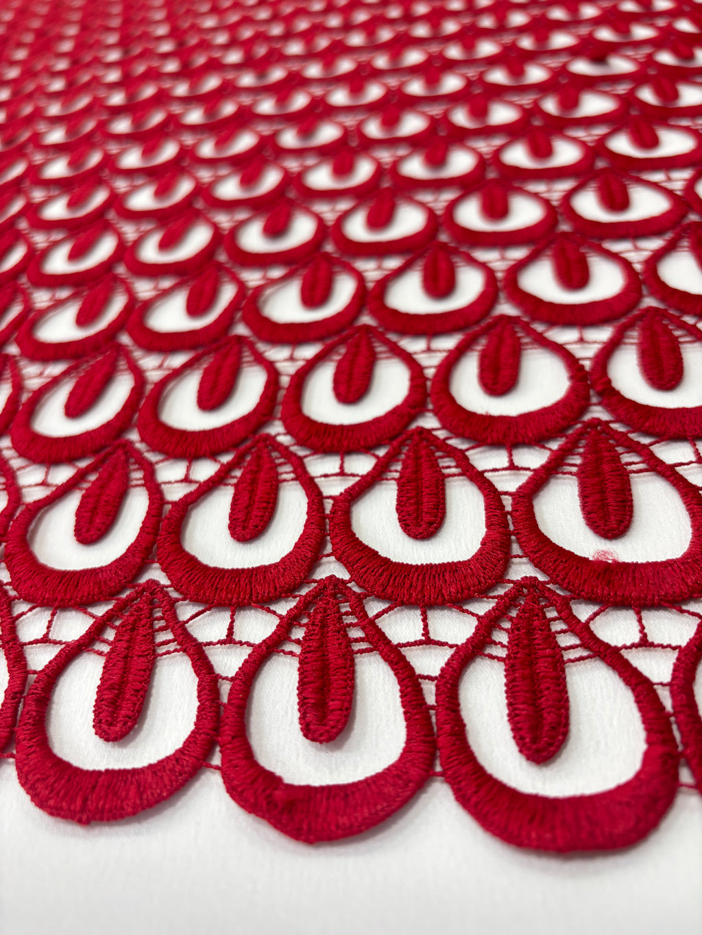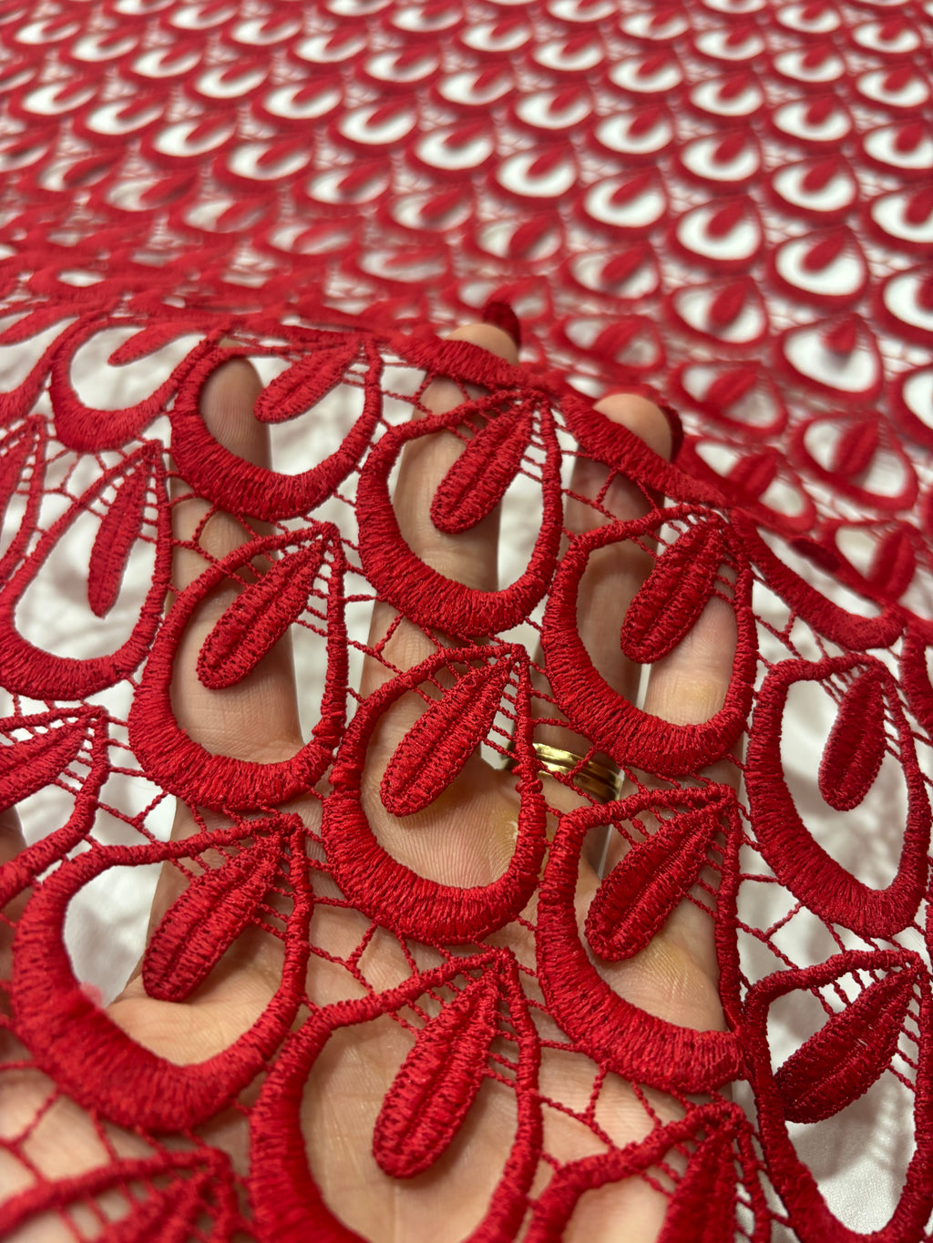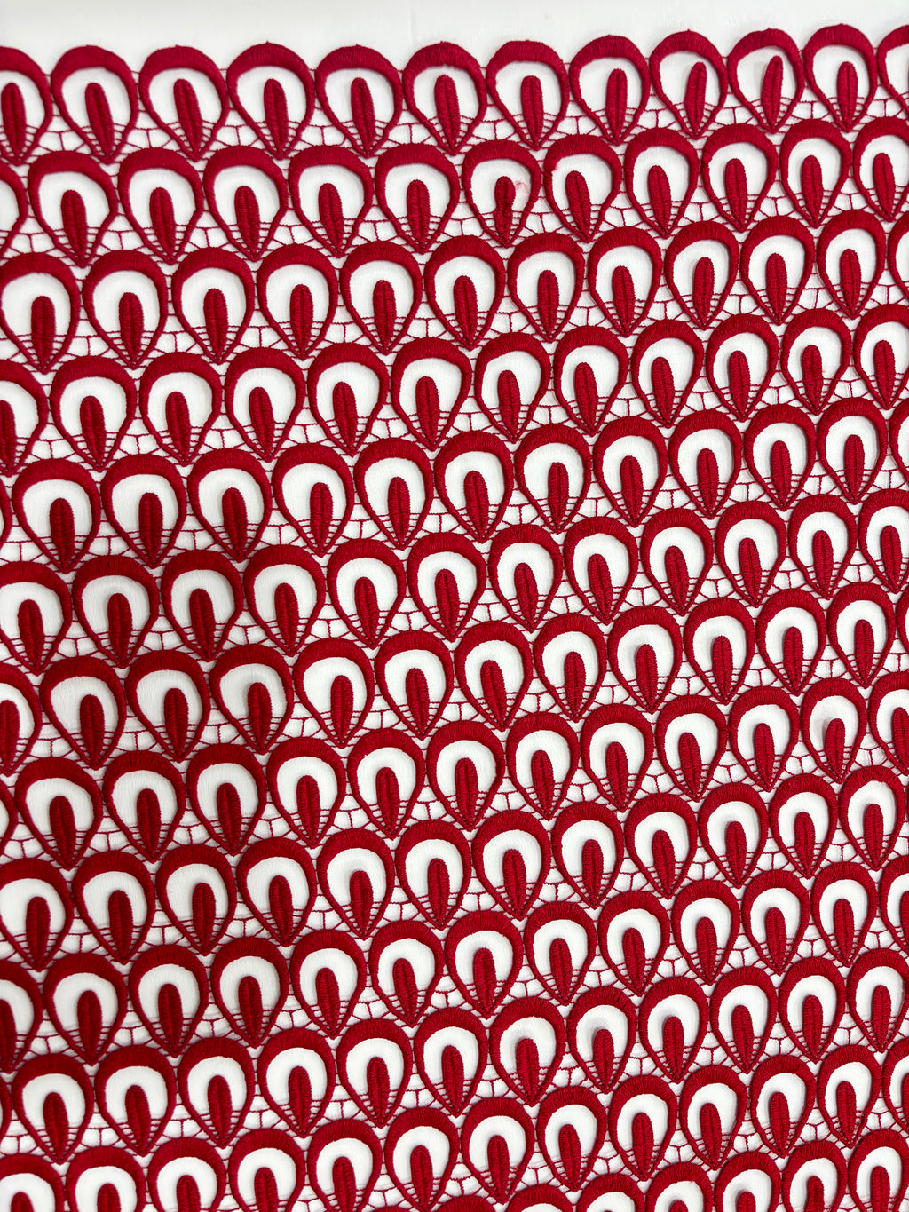 Renda guipir vermelha com padrão geométrico. Caimento mais fluido.