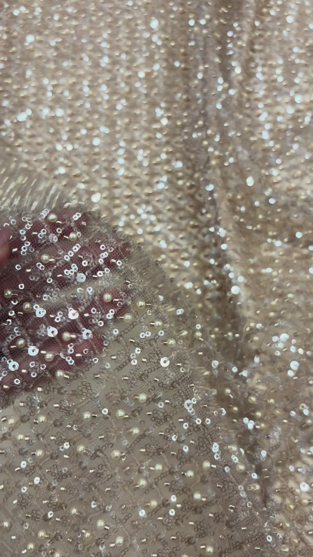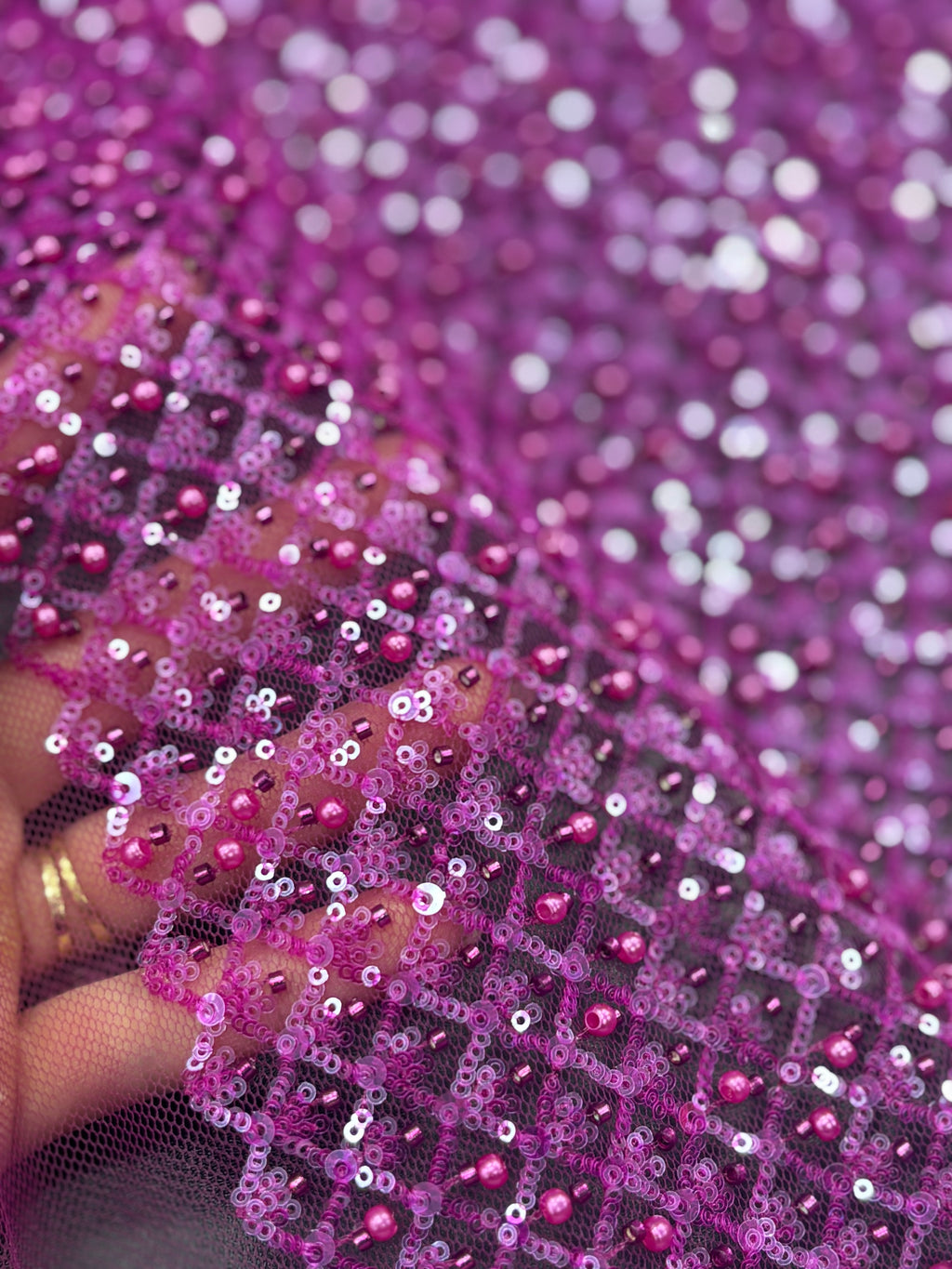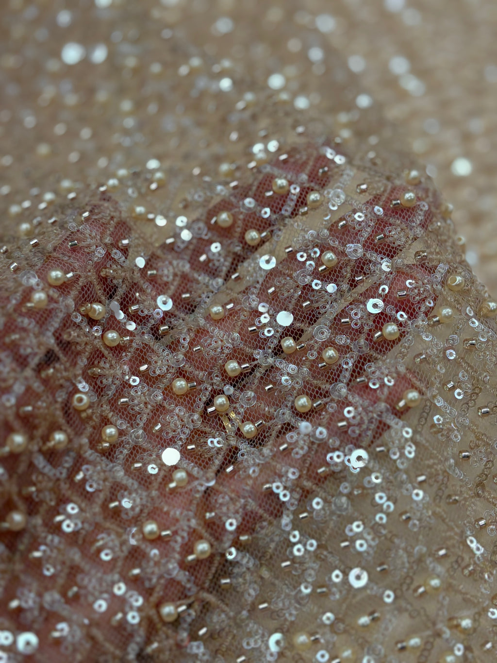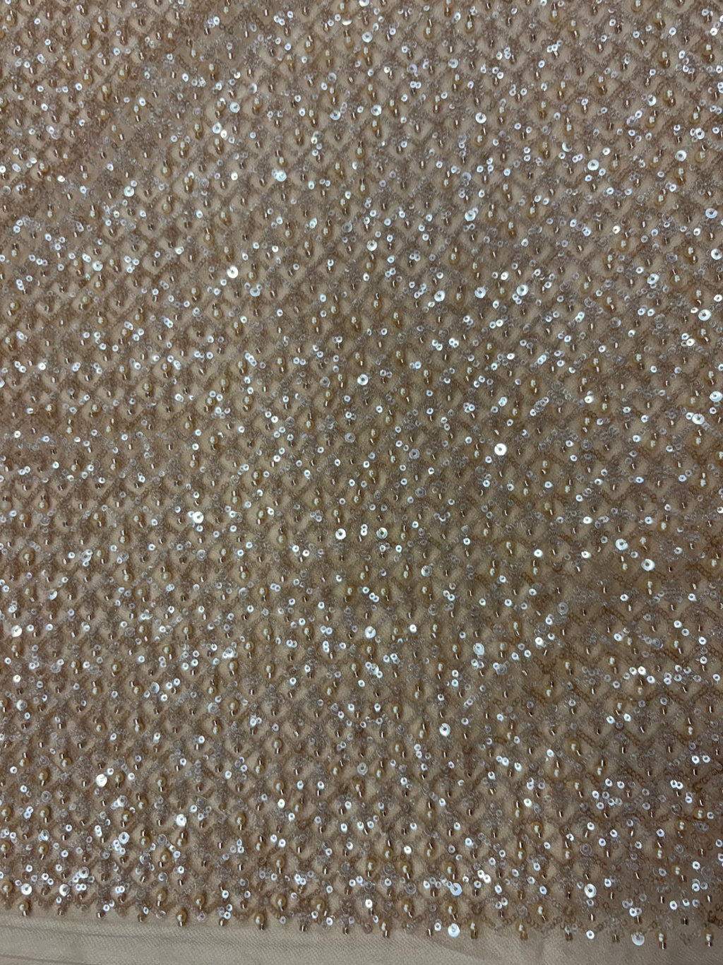 Tule bordado com paetês e pedrarias. Efeito bem brilhante. Disponível no dourado e no rosa. Padrão geométrico de losangos.