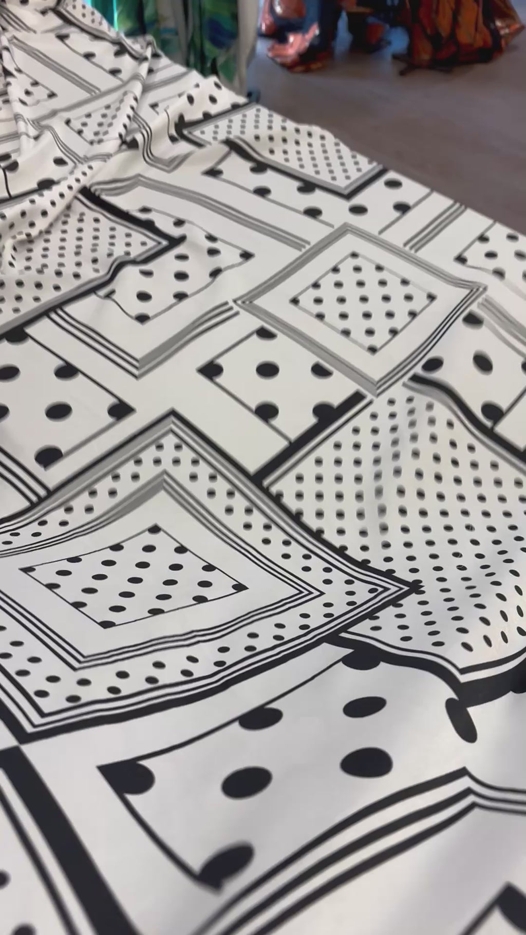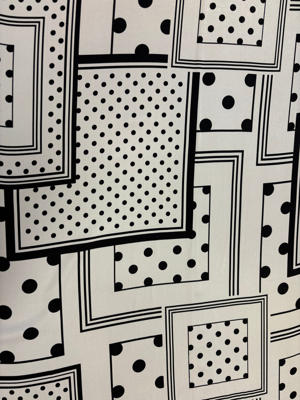 Crepe acetinado com estampa poá em diversos tamanhos com encaixes geométricos.