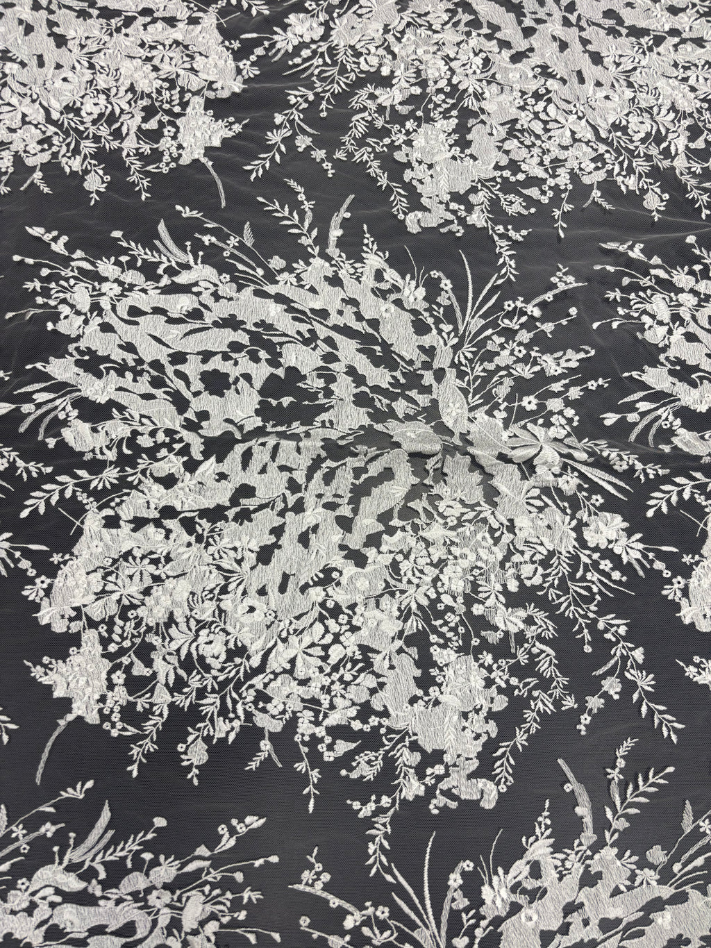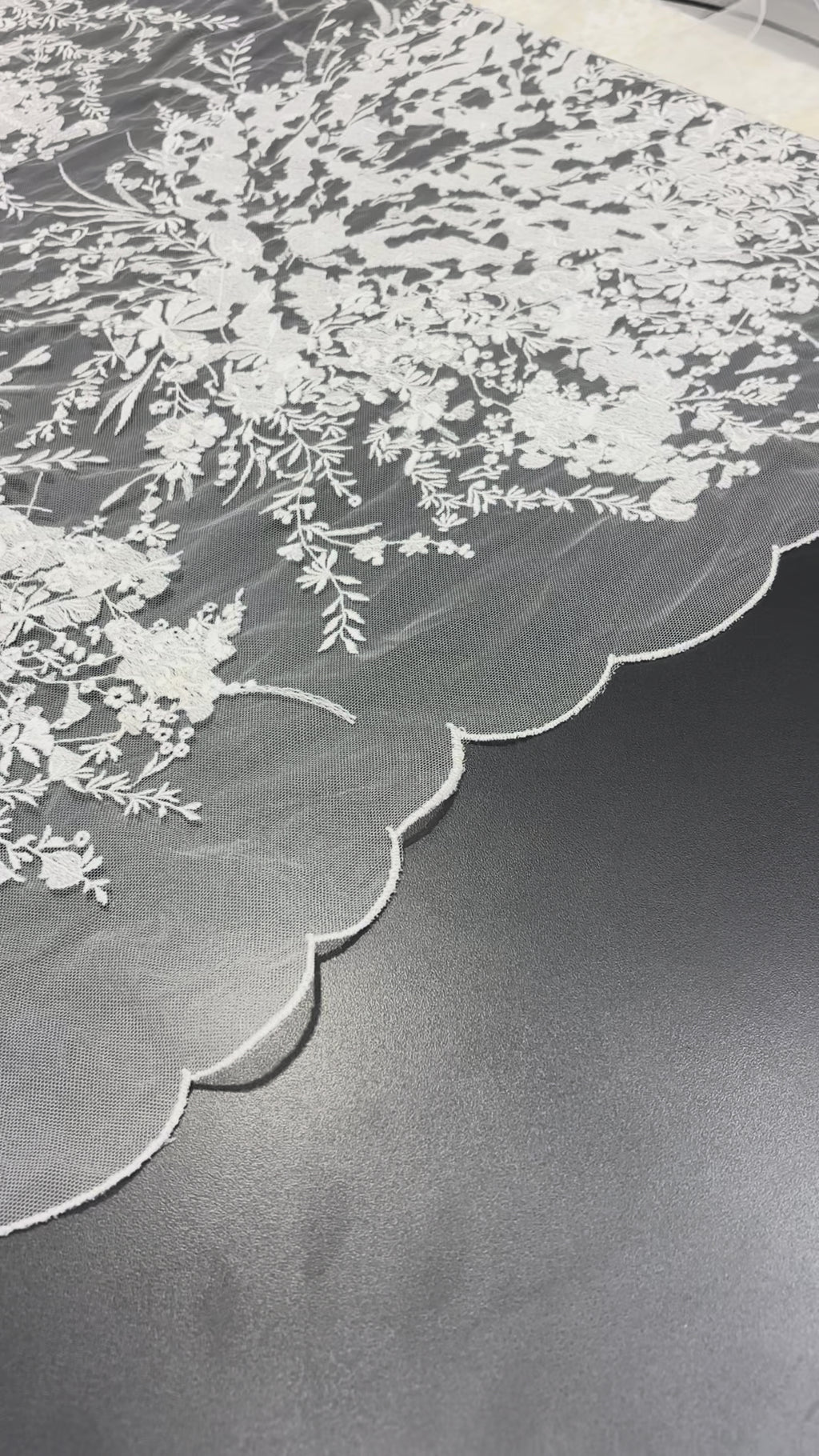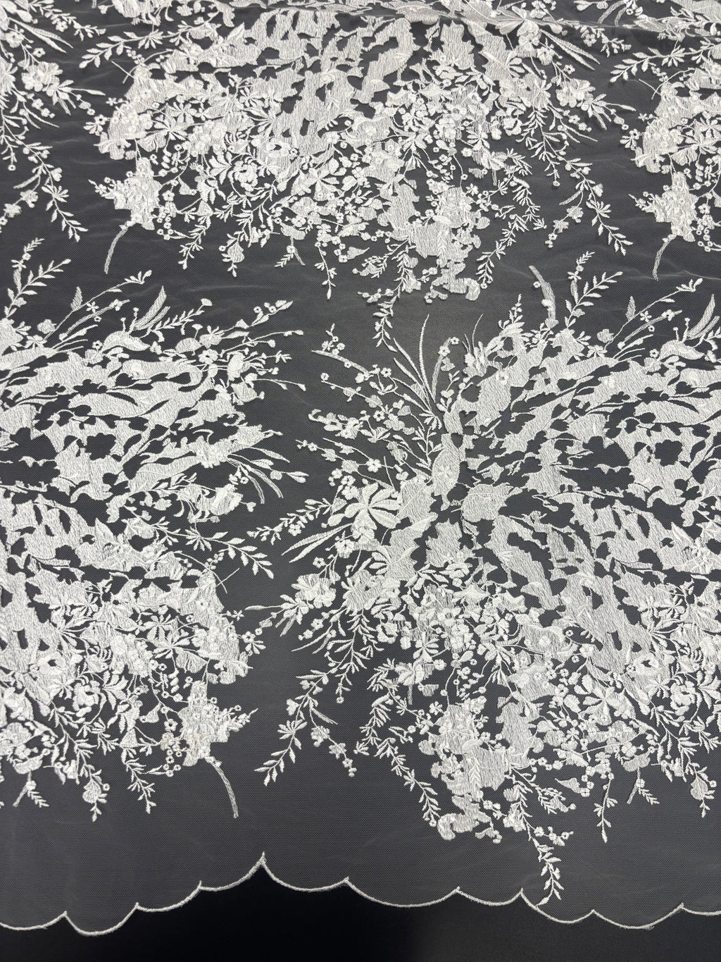Renda off white, bico dos dois lados, sem pedraria, padrão floral bem abstrato.