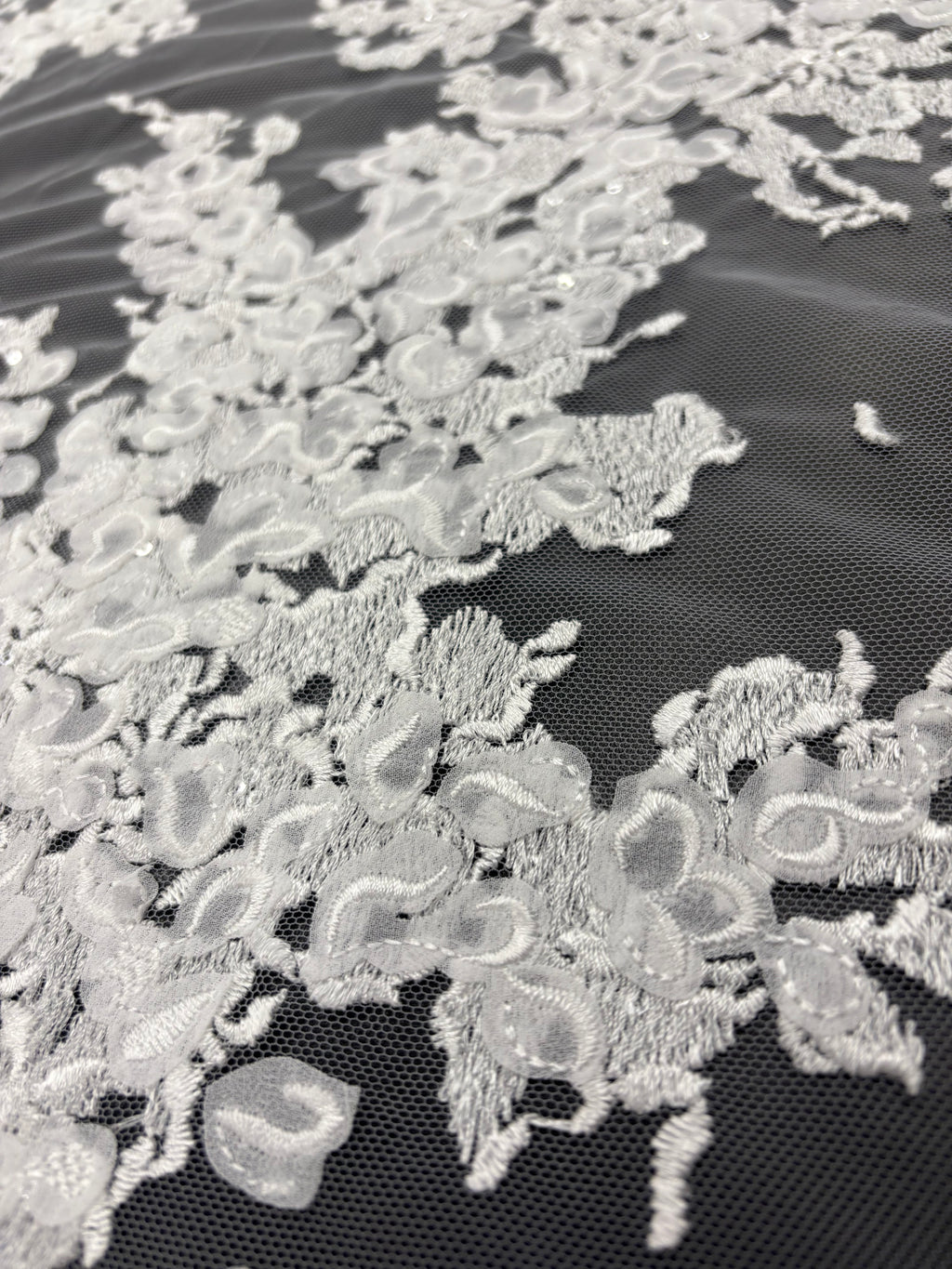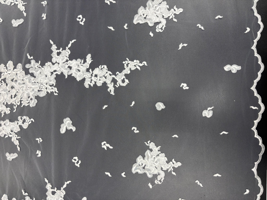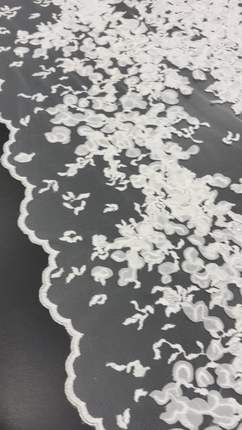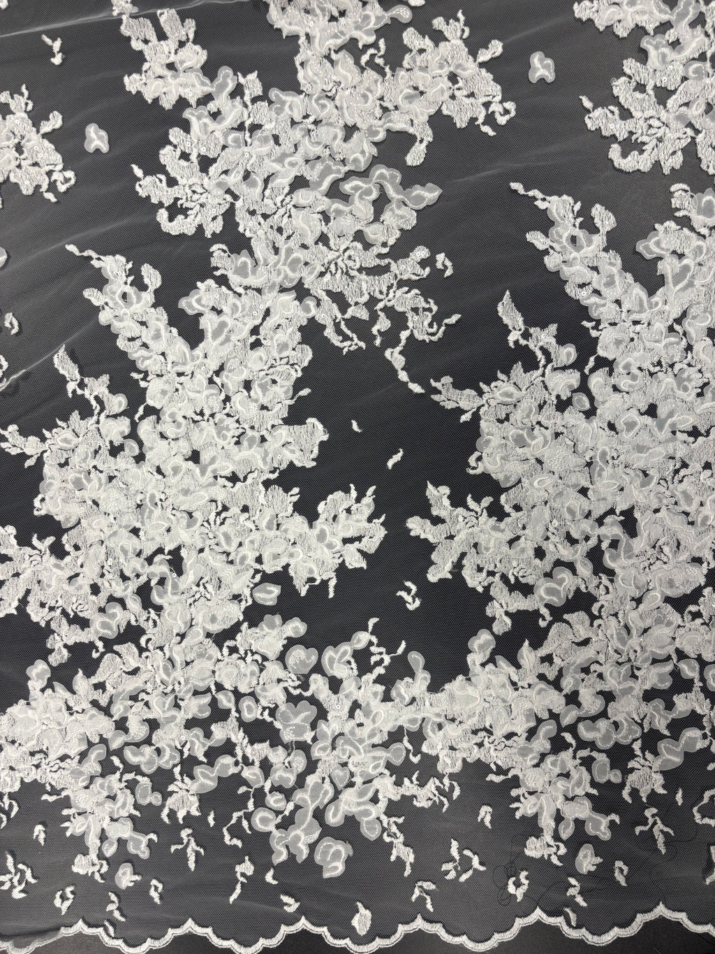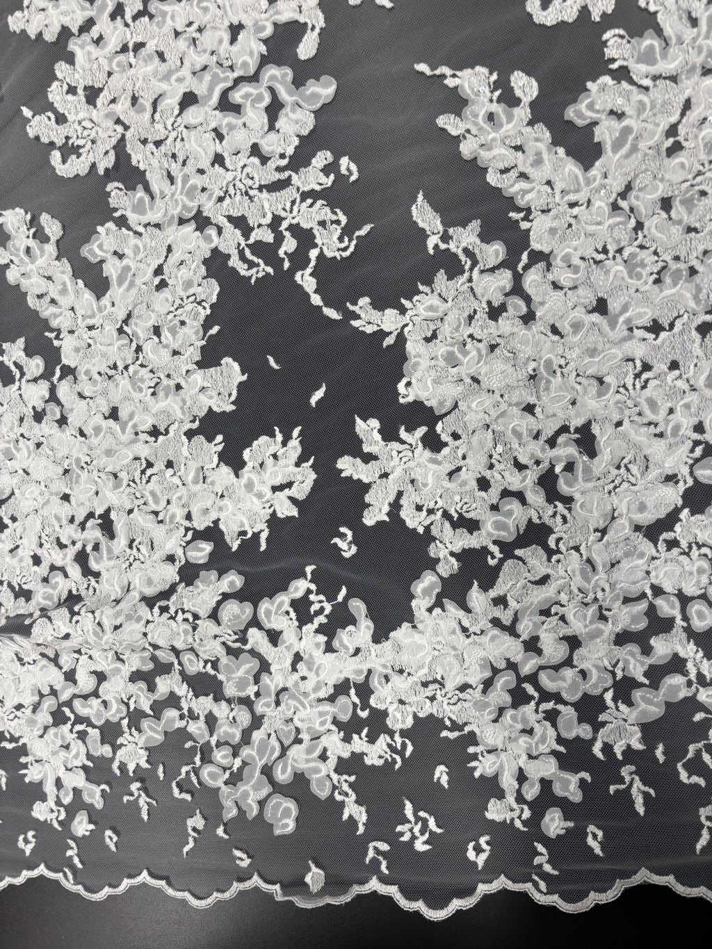 Renda branca, barrada, bico dos dois lados, padrão floral, bordado com georgete e alguns micro paetês transparentes bem discretos.